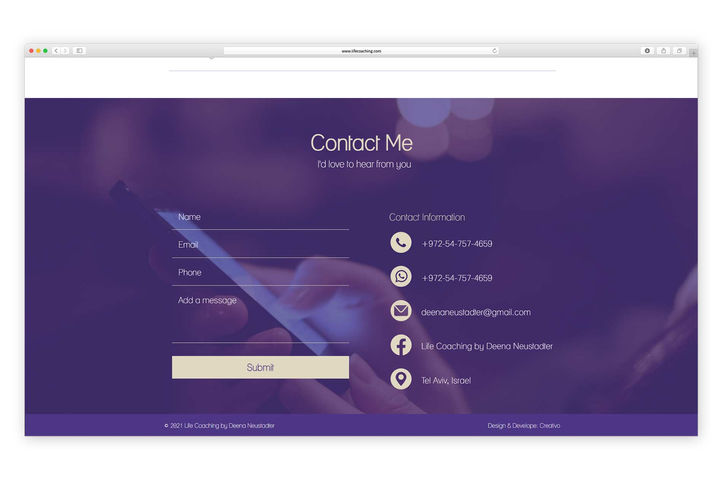עיצוב ופיתוח אתר תדמית של עמוד אחד המשדר נשיות עוצמתית למאמנת פיתוח אישי לנשים לאחר גירושין. האתר ובחירת הצבעוניות כחלק מתהליך המיתוג, מעבירים את המסרים של הלקוחה בצורה המדוייקת ביותר
